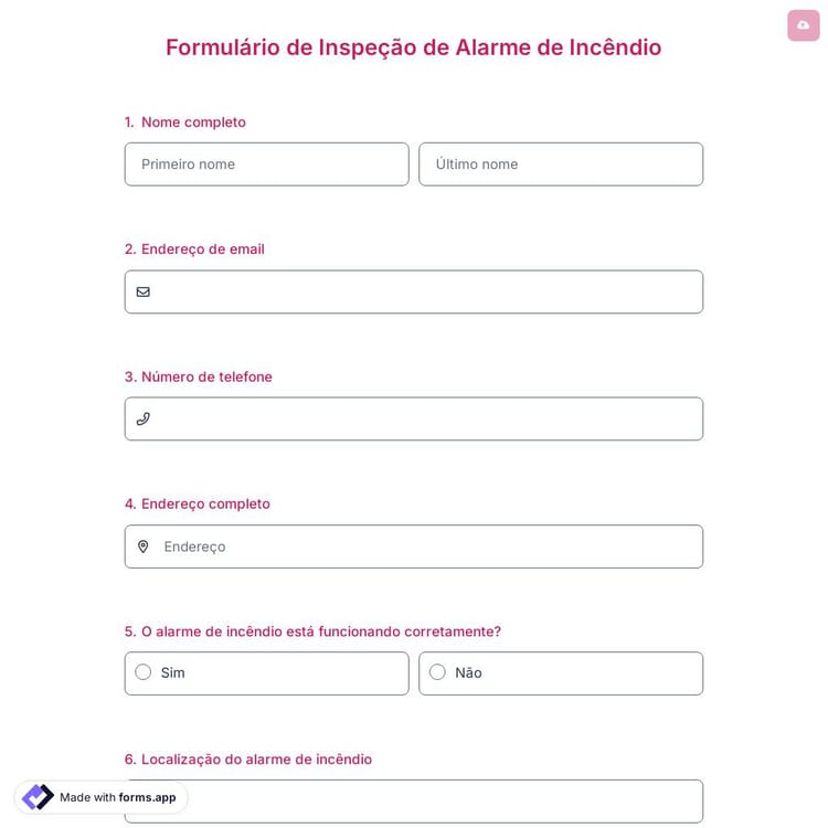 Um formulário de inspeção de alarme de incêndio é um tipo de formulário online que facilita o trabalho dos inspetores ao examinar os alarmes. Esses modelos de formulário de inspeção contêm vários campos necessários, portanto, não é necessário adicionar perguntas adicionais. No entanto, se desejar, o forms.app oferece opções avançadas de personalização.