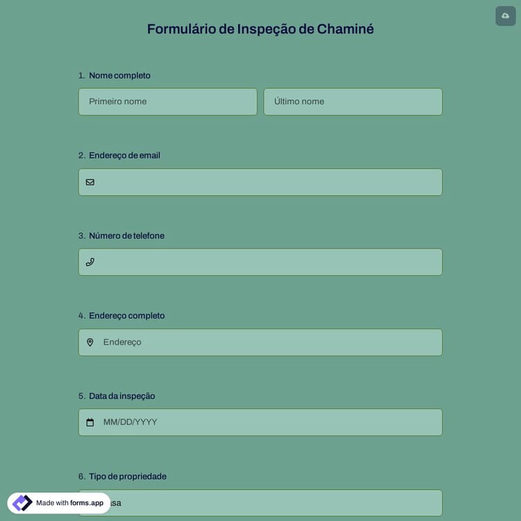 Se você é um inspetor de casa ou um proprietário procurando inspecionar a chaminé do seu prédio em relação à integridade estrutural e aos riscos potenciais de incêndio de uma chaminé, você pode usar nosso modelo de formulário de inspeção de chaminé online. É gratuito e fácil de usar e inclui perguntas e campos padrão.