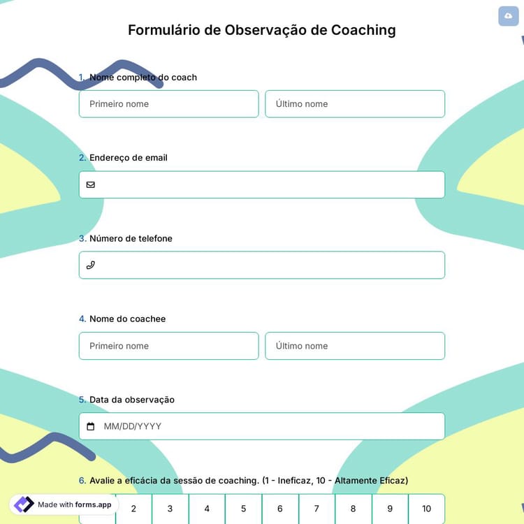 Um formulário de observação de coaching é um formulário que ajuda os participantes a apresentar suas ideias. Esses modelos de formulário de feedback contêm perguntas que medem o sucesso do coach em termos de educação e organização. Você pode criar formulários profissionais usando os recursos avançados do forms.app.