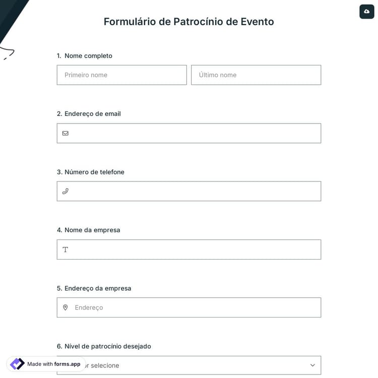Veja este formulário de patrocínio de evento e clique em "usar modelo" depois de se certificar de que é isso que você está procurando.