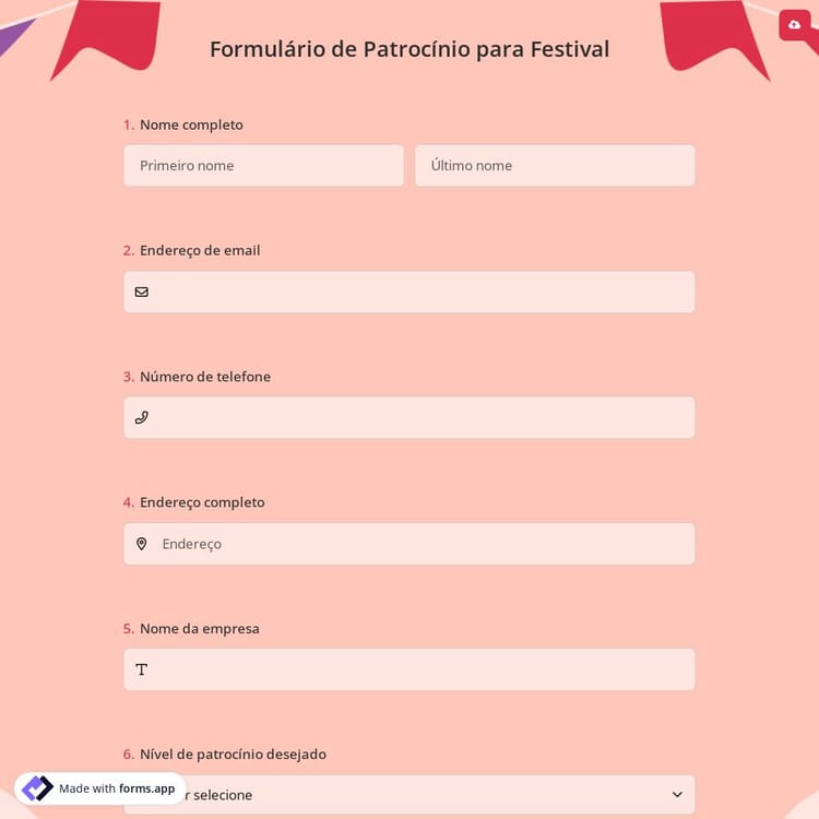Se você está interessado em patrocinar um festival, este modelo de formulário de patrocínio para festival é o que você precisa. Um formulário de patrocínio para festival é uma maneira de fechar um acordo entre um patrocinador e um organizador de festival. Você pode facilmente criar seu formulário de patrocínio usando este modelo pronto ou criando seu próprio formulário do zero com o forms.app.