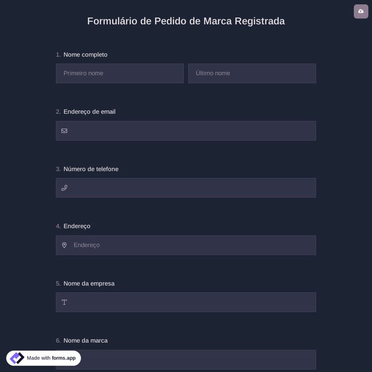 Um formulário de solicitação de marca é um documento online usado para solicitar à agência governamental competente do seu país a obtenção de uma marca. Este formulário de solicitação contém campos de formulário que solicitam informações sobre o solicitante e os detalhes da marca.