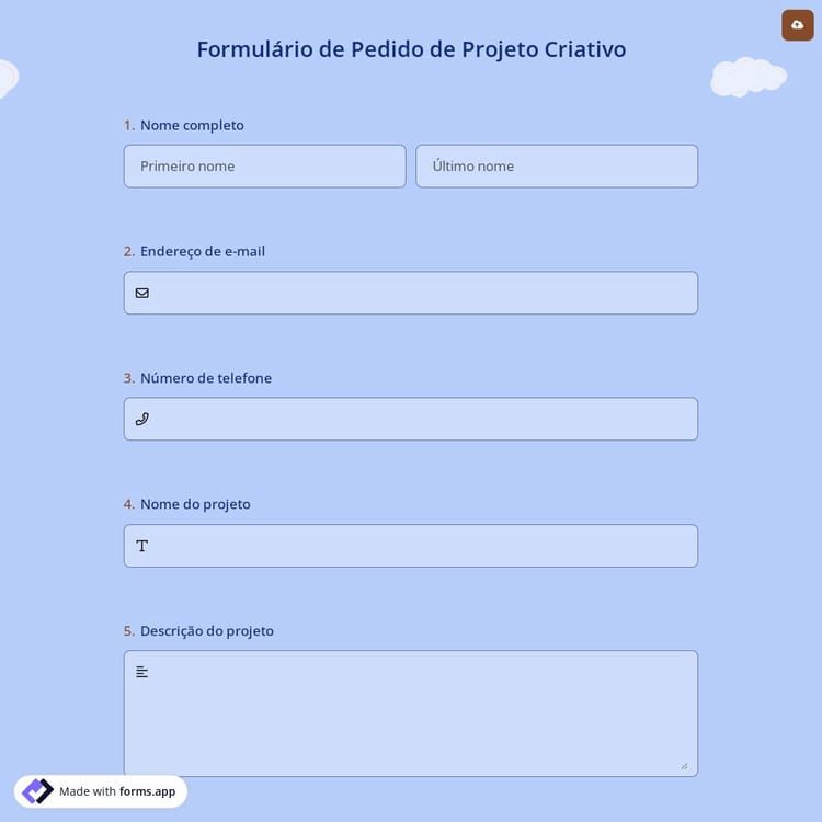 Um formulário de solicitação de projeto criativo é um formulário de solicitação para coletar informações de potenciais criadores que desejam enviar seus projetos de acordo com a natureza do projeto desejado. Eles geralmente coletam informações sobre o escopo do projeto, prazos, orçamento e requisitos técnicos ou especificações.
