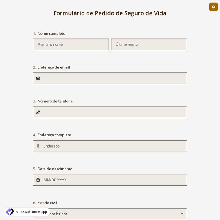 Precisa de um formulário de pedido de seguro de vida para a sua empresa de seguros? Você pode criar um formulário perfeito personalizando-o você mesmo. E o mais importante é que é gratuito para usar e compartilhar. Comece a criar o seu formulário usando o modelo de formulário de pedido de seguro de vida abaixo!