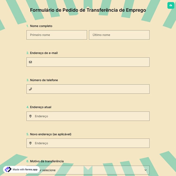 A decisão do empregador de transferir seu emprego pode ser um processo demorado, então você não quer perder tempo. Com o forms.app, você pode coletar todos os dados necessários do empregador, como nome, departamento, cargo, etc. Com apenas um formulário de pedido online, a transferência de empregadores em sua empresa não será mais complicada.