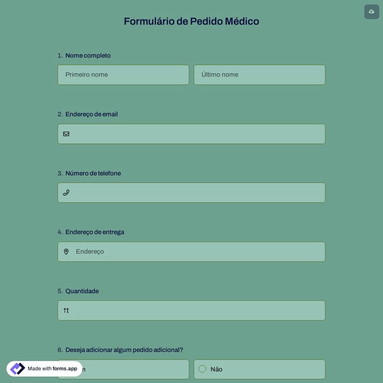 Um formulário de pedido médico é um documento que descreve o plano de tratamento e medicamentos de um paciente e ajuda a solicitar um serviço. No forms.app, você pode tornar seu formulário de pedido médico mais eficiente seguindo as dicas a seguir: