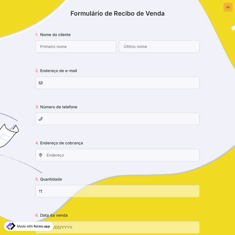 Seja uma empresa que vende ou um prestador de serviços, os clientes querem ver recibos para seus pagamentos. Você pode ajudar os clientes a solicitar uma fatura fornecendo um formulário online. Use o modelo de formulário de recibo de venda gratuito do forms.app para criar seu formulário online em poucos minutos!