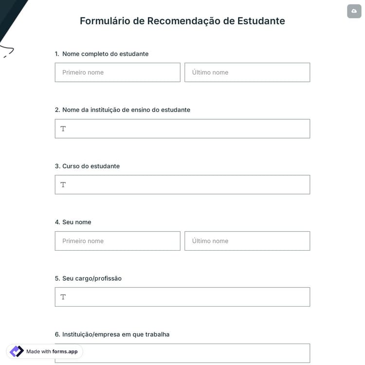 As escolas podem precisar de transferências de estudantes ao longo de sua vida escolar. Com as recomendações de estudantes, a vida escolar dos estudantes será muito melhor. Você pode usar a ferramenta online gratuita forms.app se precisar de um formulário de recomendação de estudante.