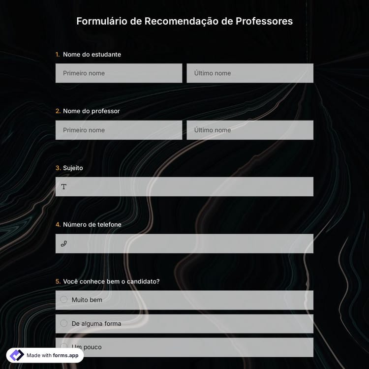 O modelo de formulário de recomendação de professores do forms.app, um tipo de formulário de solicitação, tem algumas perguntas padrão, como: