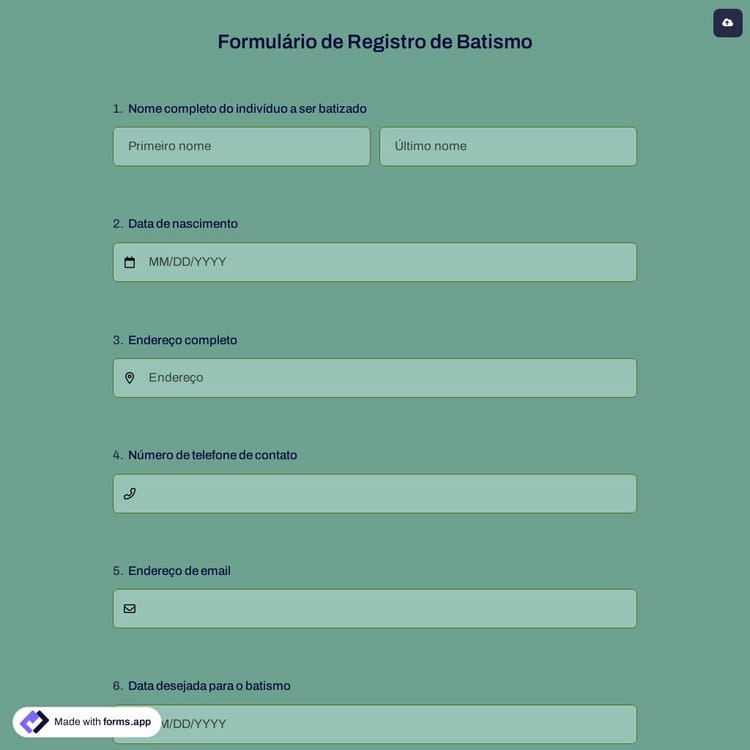 Um formulário de inscrição para batismo é um documento online usado por igrejas para coletar informações sobre as pessoas a serem batizadas. Este formulário é geralmente usado para registrar pedidos de cerimônia de batismo e pode incluir data, hora e local. Com o modelo gratuito de formulário de inscrição para batismo da forms.app, crie facilmente um formulário profissional que o ajude a coletar todas as informações necessárias.