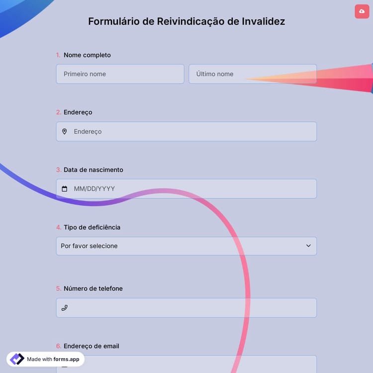 Se estiver criando um formulário de reivindicação de invalidez para uma seguradora, você também precisará incluir campos para informações do segurado, como número da apólice e datas de cobertura. Além disso, você pode coletar arquivos por meio de um campo de upload de maneira fácil e rápida. Você também pode adicionar termos e condições para seguro de invalidez e um campo de assinatura ao seu formulário online. Depois de selecionar o modelo de formulário de reivindicação de invalidez e criar um formulário personalizado, você pode simplesmente incorporá-lo ao site do governo federal ou ao site da sua seguradora usando o código incorporado. Então comece agora e crie seu formulário sem nenhuma codificação!