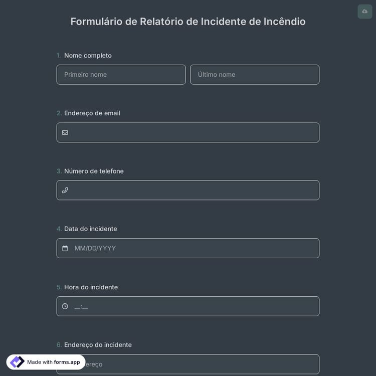 Use este modelo para um formulário de relatório de incidente de incêndio para registrar e relatar qualquer incidente relacionado ao fogo. O objetivo é fornecer uma narrativa sobre a causa de um incidente de incêndio, os danos ou lesões sofridos e qualquer perda de vida. Comece agora com forms.app para facilmente criar seu modelo gratuito.