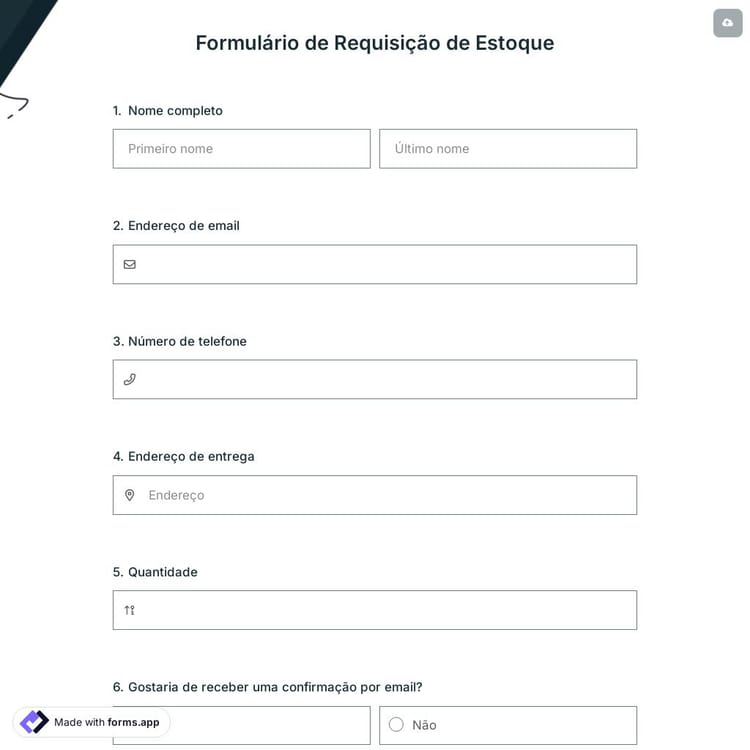 Um formulário de solicitação de estoque é usado pelos clientes para solicitar os produtos que desejam. Os clientes podem usar este formulário de solicitação de estoque quando desejam renovar seu inventário. Edite gratuitamente este formulário de solicitação com dezenas de temas coloridos e modifique as perguntas de acordo com suas necessidades. Você pode criar seu formulário de solicitação de estoque em poucos cliques no forms.app.