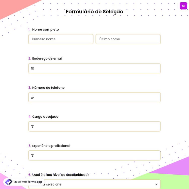 Um formulário de pré-seleção é um tipo de formulário para participantes qualificados. É utilizado para selecionar os participantes que formarão a próxima etapa de um evento, exame ou entrevista. Você pode atender a essa necessidade com o modelo gratuito fornecido pelo forms.app. Comece usando o modelo de formulário de lista restrita agora!