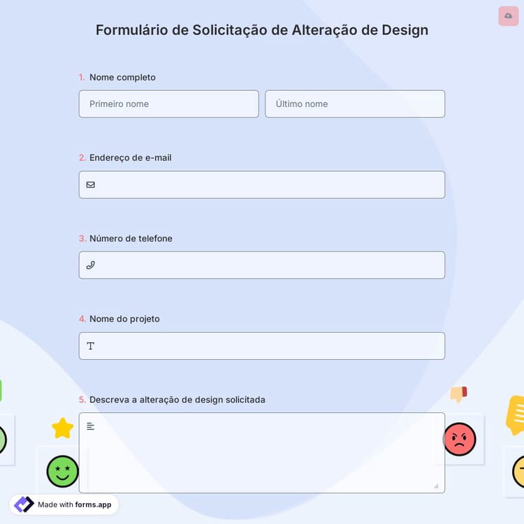 Uma solicitação de alteração de design significa uma solicitação de modificações em uma função específica. Você pode enviar uma solicitação de alteração usando um modelo de formulário de solicitação de alteração de design. Quando seus clientes fazem solicitações de alteração de design, sua equipe pode seguir um procedimento predefinido para analisar e executar as modificações do projeto. Você pode criar e compartilhar seu formulário de solicitação no forms.app em questão de segundos.