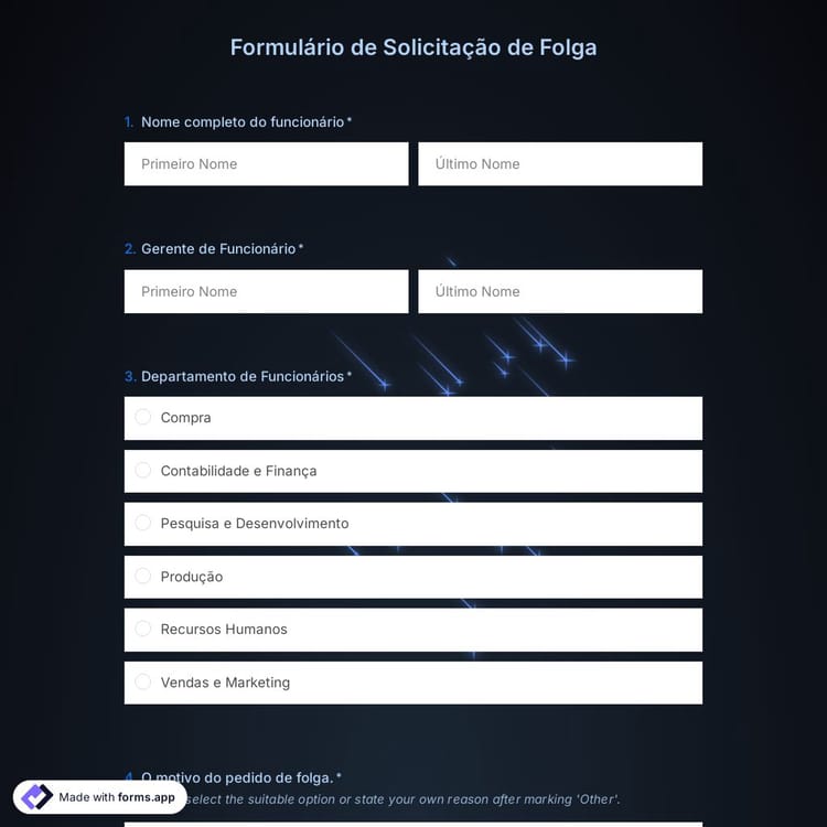 Um formulário de solicitação de folga online é um tipo de formulário desenvolvido para coletar solicitações de folga de seus funcionários e gerenciar seus processos de recursos humanos de maneira muito mais eficiente. Com o forms.app é este modelo de formulário de solicitação de folga online prontamente disponível, você não precisará mais preencher formulários em papel ou se esforçar com formulários em Word ou PDF Além disso, você poderá personalizar seu formulário de solicitação de folga e conectá-lo a aplicativos de terceiros para processos mais organizados.