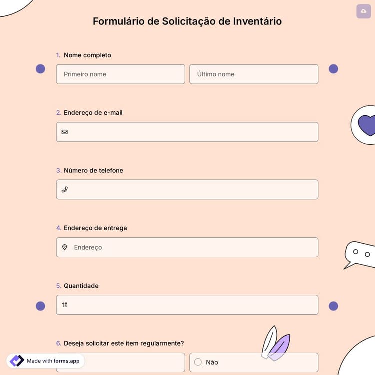 Se você possui uma pequena ou grande empresa, a gestão de estoques é necessária. Se você está solicitando estoque do armazém ou de fontes externas, use este formulário. Para informações sobre clientes regulares, a pesquisa de dados é uma ferramenta útil. O formulário de solicitação de estoque é fácil de obter e usar no forms.app.