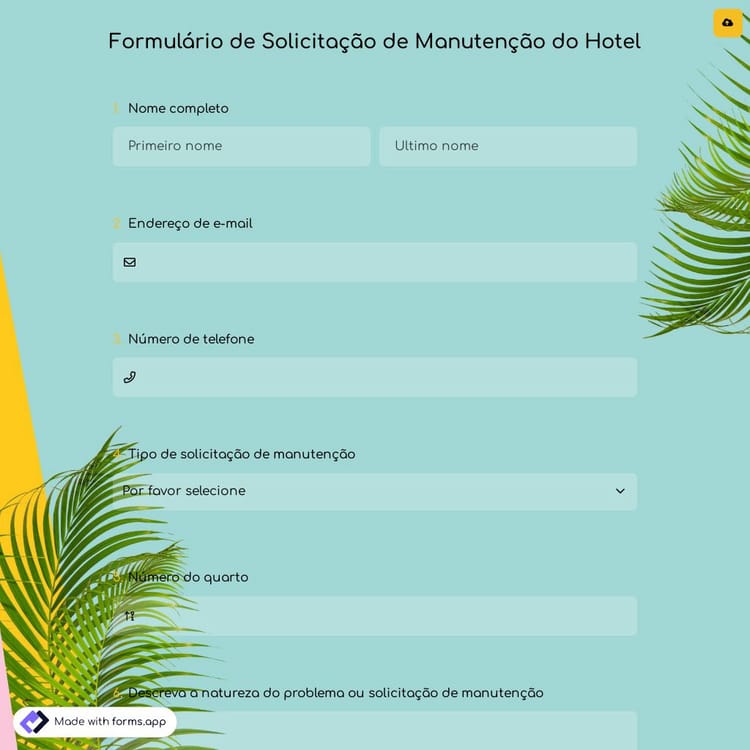 Um formulário de solicitação de manutenção de hotel é um documento online usado para identificar problemas de manutenção e coletar solicitações de serviço. Os formulários de solicitação de manutenção de hotel permitem que seus clientes informem você de forma adequada quando ocorrer um problema de manutenção ou serviço. Você pode adicionar ou remover perguntas do formulário de solicitação de manutenção de hotel pronto para uso. Por fim, você pode integrar seu formulario de solicitação em seu site ou imprimi-lo como um código QR para seus quartos.