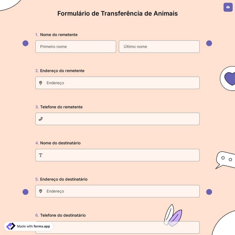 Você gostaria de receber solicitações de transferência de animais com mais frequência e online? Com o modelo de formulário de transferência de animais, você pode criar e personalizar seu próprio formulário em poucos minutos sem precisar escrever código. Comece a construir formulários com forms.app!