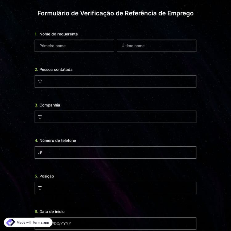 Este template de forms.app que você vai usar no processo de checagem de referências vem com algumas perguntas básicas. Aqui estão alguns deles: