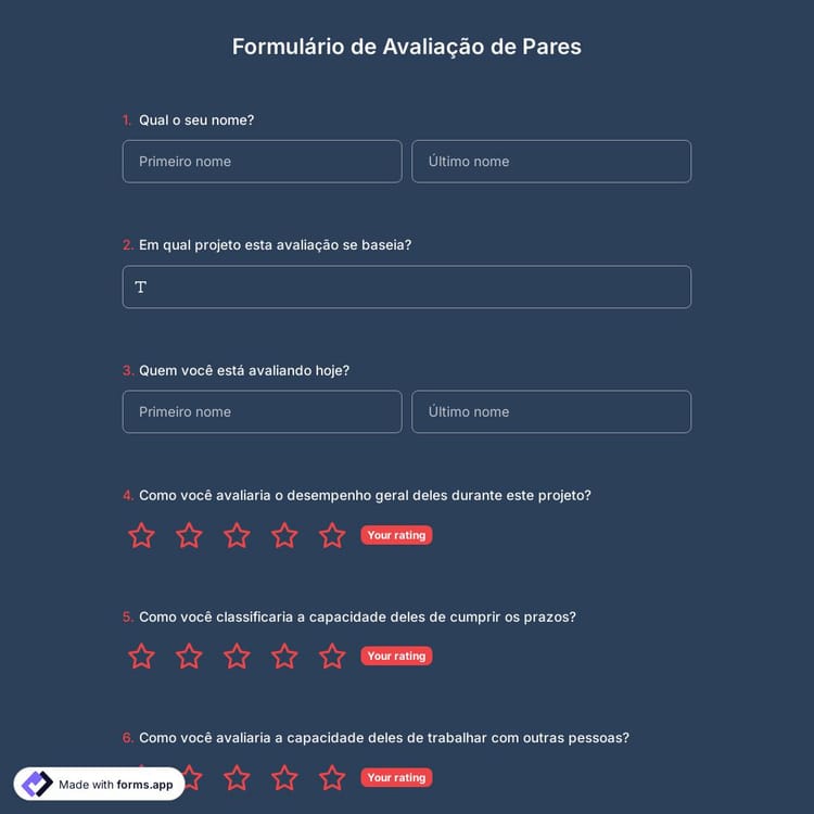 Um formulário de avaliação por pares ajuda a coletar feedback valioso de seus funcionários ou alunos. Graças a este feedback, você pode avaliar facilmente o desempenho ou cooperação e obter uma visão profunda de como eles trabalham ou estudam. Selecione o modelo de formulário de avaliação de pares gratuito do forms.app e comece a coletar feedback hoje!