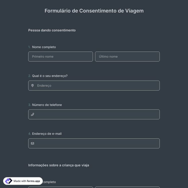 Um formulário de consentimento de viagem é usado para coletar o consentimento dos pais para crianças que viajam sozinhas ou em grupo. Também torna o processo mais fácil e sem esforço para você e para os pais. Use o modelo de formulário de consentimento para viagens gratuitas do forms.app para coletar documentos de consentimento agora!