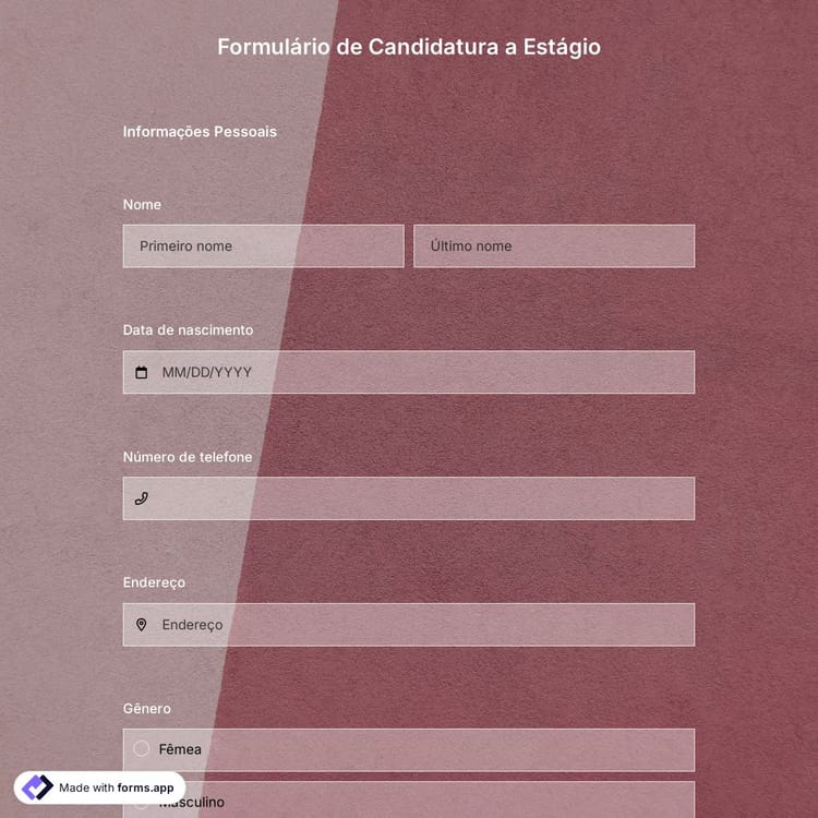 Um formulário de inscrição para estágio online ajuda você a coletar as informações necessárias para vagas de estágio. E torna o processo de avaliação mais rápido para você. Com um formulário de inscrição de estágio, as pessoas podem se inscrever facilmente para vagas em aberto a qualquer momento. Escolha o modelo de formulário de inscrição de estágio do forms.app e tenha os melhores candidatos para estágios em sua empresa!