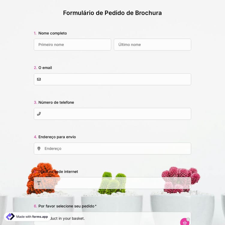O forms.app oferece a você um exemplo de formulário altamente personalizável. Inclui todos os campos necessários para facilitar o processamento do pedido para todos. Você coletará facilmente informações de contato e permitirá que as pessoas saibam sobre seus pedidos. As pessoas também podem escolher uma data de entrega para seus pedidos. Use o modelo de formulário de pedido de brochura gratuito do forms.app para criar seu formulário e coletar pedidos automaticamente!