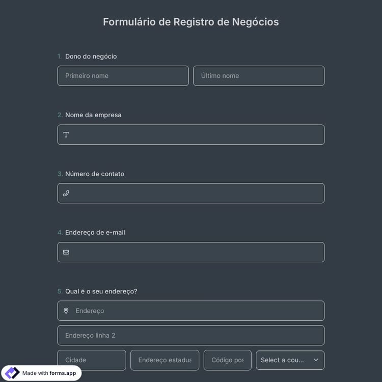 Os formulários de registro de empresas online ajudam a coletar informações sobre o nome, proprietário e tipo de empresa. Com os registros online, o processo de registro de empresas será muito mais fácil e flexível para todos. Use o modelo de formulário de registro de negócios gratuito do forms.app e crie seu formulário hoje!