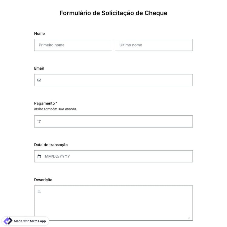 Como método de pagamento, os cheques são usados com frequência hoje em dia. E a melhor maneira de iniciar uma transação comercial é por meio de um formulário de solicitação de cheque. Use o modelo de formulário de solicitação de cheque online do forms.app e compartilhe seu formulário com seus parceiros de negócios ou incorpore-o em seu site hoje mesmo!