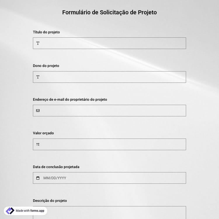 Perguntas e campos em um formulário de solicitação de projeto podem variar de acordo com o tipo de trabalho ou a equipe de gerenciamento do projeto. Mas a maioria deles inclui algumas perguntas semelhantes sobre os projetos. Por exemplo, o título do projeto, informações pessoais dos membros da equipe, tipo do projeto, detalhes de contato da equipe do projeto são necessários para iniciar o processo de revisão.