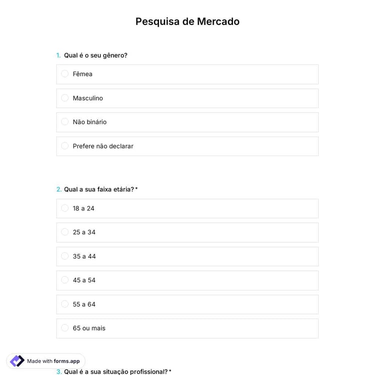 Uma pesquisa de mercado pode ser útil por vários motivos. Por exemplo, se você vende produtos ou fornece serviços, fazer uma pesquisa de mercado fornecerá dados valiosos sobre as condições de mercado, o comportamento do cliente e outros concorrentes. Este modelo de pesquisa de mercado gratuito no forms.app pode ajudá-lo a criar suas pesquisas e coletar informações sem esforço!