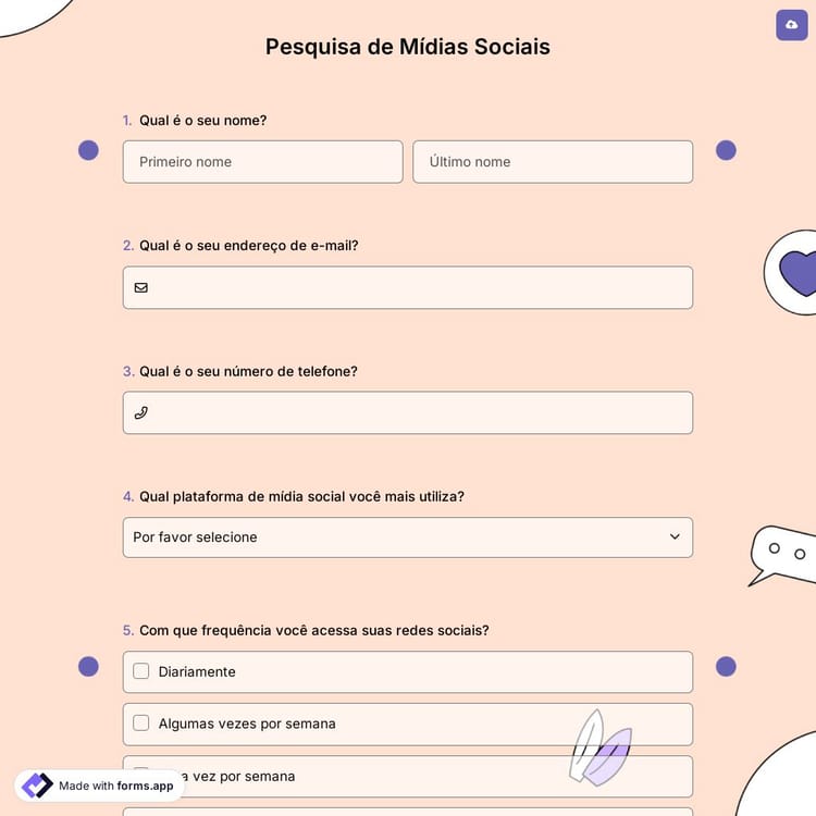 Aprender os hábitos de mídia social do seu público-alvo é fácil com forms.app. Você pode criar ou personalizar pesquisas prontas para mídias sociais, avaliar seus planos de marketing e facilmente selecionar clientes adequados para seus anúncios. Além disso, criar formulários e pesquisas é gratuito com forms.app.