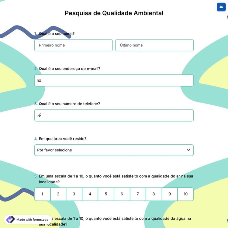 As pesquisas de qualidade ambiental permitem coletar feedbacks importantes para coletar dados para o desenvolvimento de políticas e regulamentos ambientais. Use o modelo de pesquisa de qualidade ambiental online gratuito para criar sua pesquisa de qualidade ambiental em poucos minutos e personalizá-la como desejar!
