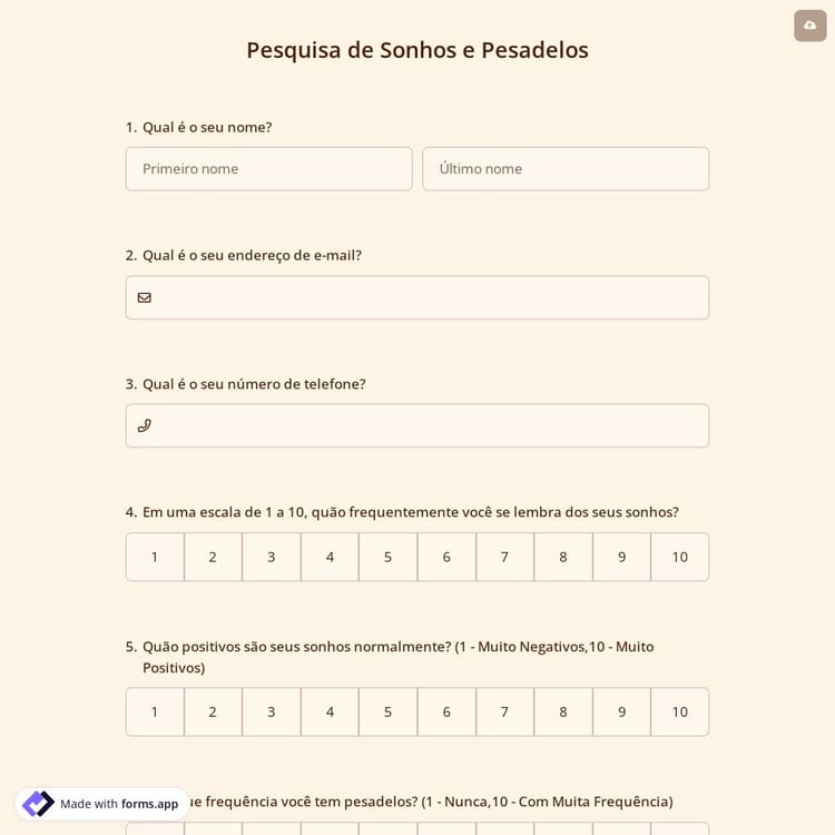 Quer ver o efeito que os sonhos e pesadelos têm nas pessoas? Com o modelo de pesquisa de sonhos e pesadelos, você pode descobrir quais visões as pessoas têm em suas vidas diárias e seus efeitos. Inscreva-se no forms.app para criar seu próprio formulário agora!
