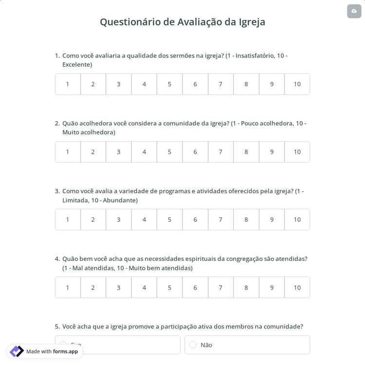 Um conjunto de perguntas conhecido como questionário de avaliação da igreja pode ser usado para avaliar a eficácia de uma igreja. Os membros são livres para expressar suas ideias, satisfação ou insatisfação com a igreja e sua comunidade. Você pode facilmente personalizar seu questionário com os recursos úteis do forms.app. Comece agora clicando no botão "usar modelo"!