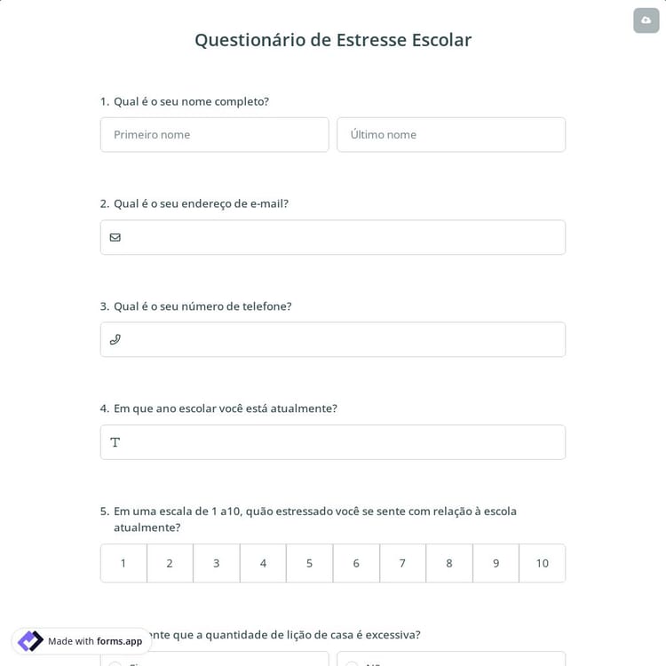 Uma pesquisa sobre estresse escolar é usada para avaliar os níveis de estresse vivenciados pelos alunos em um ambiente escolar. Pode ajudar educadores e administradores a entender as fontes de estresse para os alunos e identificar maneiras de melhorar o ambiente escolar e apoiar o bem-estar dos alunos. Com o forms.app, você pode criar uma pesquisa personalizada sobre estresse escolar em poucos minutos e sem custo!