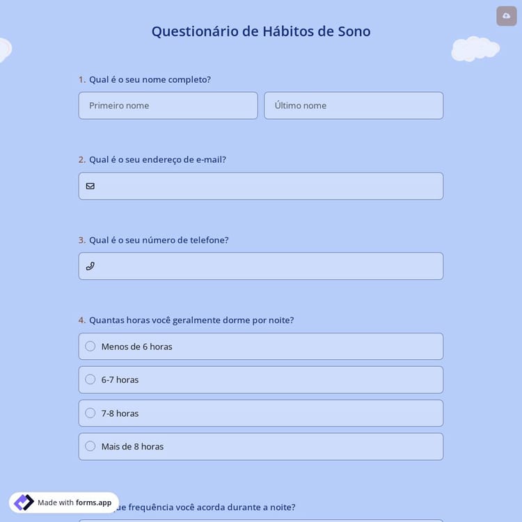 Você deseja conhecer mais rapidamente os hábitos de sono de seus pacientes? Com as perguntas do modelo de pesquisa de hábitos de sono, você pode coletar informações sobre os hábitos de sono do seu paciente antes de ele vir para um tratamento. Use o forms.app para criar pesquisas em segundos; nenhum código é necessário!
