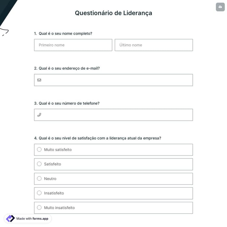 Pesquisas de liderança são uma ferramenta poderosa para organizações que buscam melhorar suas habilidades de liderança. Elas oferecem uma maneira para os líderes de uma organização se compararem com outros líderes da mesma indústria, região ou categoria. As pesquisas de liderança podem ajudar tanto as pessoas que lideram quanto as que seguem, identificando fraquezas e pontos fortes potenciais antes que eles se tornem evidentes nas avaliações de desempenho ou em outras rotinas de avaliação de habilidades de liderança. Você pode criar a sua própria usando o forms.app, ou pode escolher entre os modelos de pesquisa gratuitos.