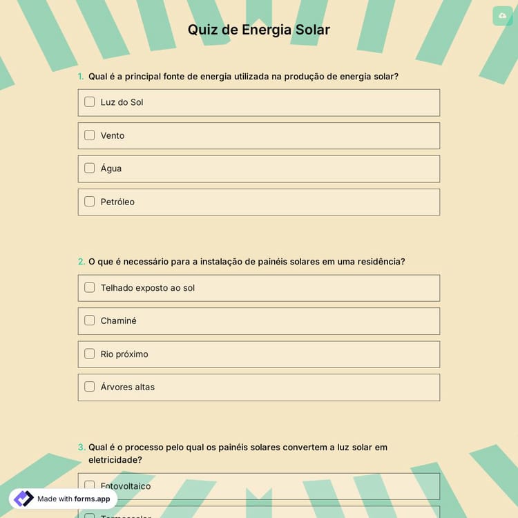 Use um quiz online para medir o conhecimento do seu público sobre energia solar ou avaliar suas opiniões. Você pode alcançar e impactar as pessoas que deseja com um quiz online. Use o modelo de quiz sobre energia solar grátis da forms.app para conscientizar e criar seu quiz hoje mesmo!