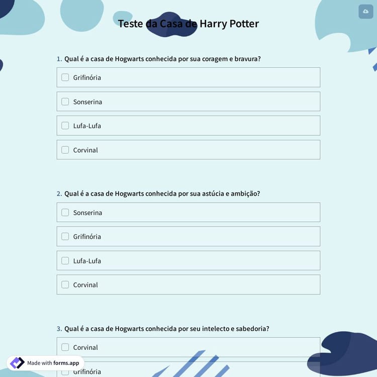 É o sonho de todos estudar em Hogwarts. Sempre nos perguntamos em qual prédio estaríamos. Aqui está sua chance! O forms.app oferece a oportunidade de criar seu quiz no qual você pode fazer perguntas para descobrir em que casa seus amigos estarão. Avise seus amigos sobre as respostas de que eles podem não querer ser sonserinos. Comece agora a usar este modelo gratuito de teste da casa de Harry Potter para criar o seu próprio!