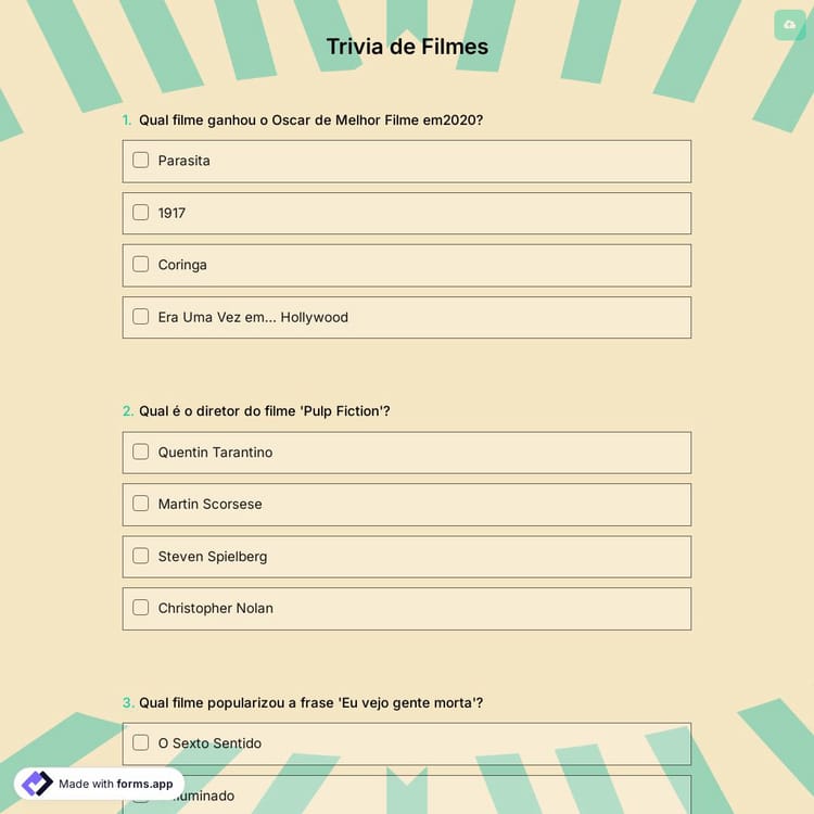 Os filmes são o melhor tipo de entretenimento, principalmente quando você está com sua família, porque é divertido conversar e discutir sobre filmes com seus entes queridos. Um filme pode nos ensinar muitas coisas, incluindo os vários tipos de indivíduos que existem neste mundo, nossas conexões uns com os outros, amor, família e amigos. Experimente o modelo gratuito de curiosidades sobre filmes do forms.app para preparar um teste melhor para seus amigos.