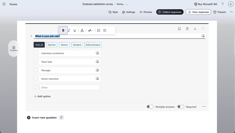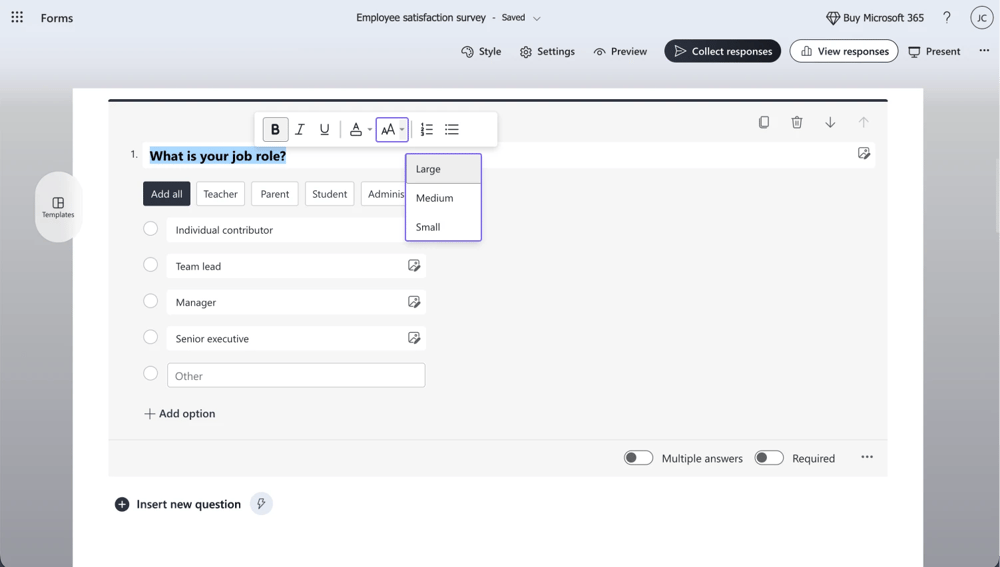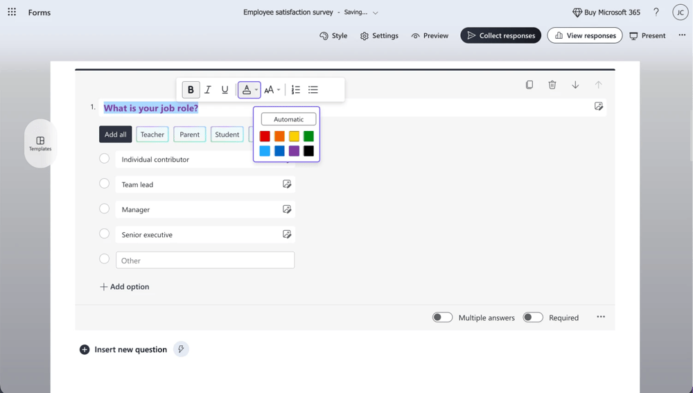 Microsoft Forms'da metni özelleştirmek temel ihtiyaçlar için etkilidir, ancak sınırlı kalmaya devam eder. Okunabilirliği artırmak için Microsoft Forms'da yazı tipi boyutunu kolayca değiştirebilir, kalın veya italik vurgular uygulayabilir ve renkleri ayarlayabilirsiniz, ancak temel yazı tipi ailesini değiştiremez veya markaya özel yazı tiplerini içe aktaramazsınız.