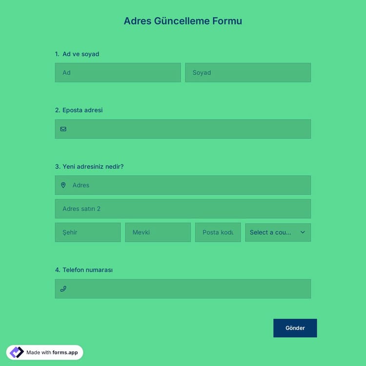 Kişilerin hesaplarındaki adresleri değiştirmek için bir çözüm mü arıyorsunuz? Ardından, sizin için basitçe bir çevrimiçi adres güncelleme formu yapılır. O halde, formlarınızı bugün forms.app'in ücretsiz adres güncelleme formu şablonunu kullanarak oluşturun!