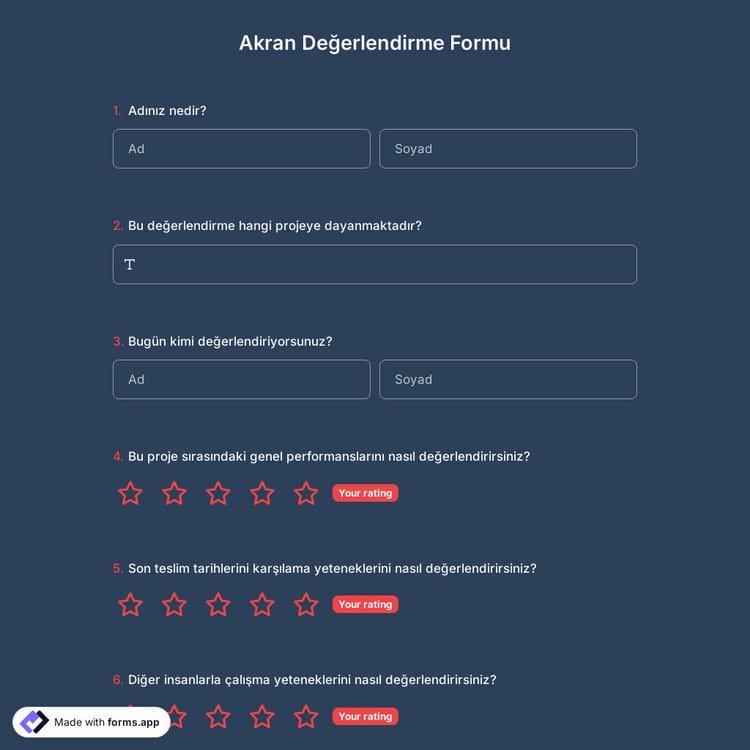 formlar.app, sınıfınız veya işiniz için size ücretsiz bir değerlendirme formu örneği sunar. Ortak ve gerekli tüm soruları içerdiği için, akran değerlendirme formu şablonunu hiçbir şeyi değiştirmeden kullanabilirsiniz. Bu size zaman ve emekten tasarruf sağlayacaktır. Ancak, fazladan sorular da ekleyebilir ve mevcut olanları kaldırabilir veya düzenleyebilirsiniz.