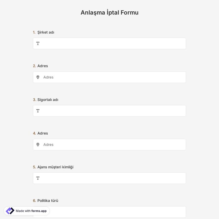 Online Anlaşma İptal Formu Şablonu, anlaşmaya muhatap olan tarafların anlaşmayı bozduğunu bildiren bir belgedir. Genelde Talep Formları ile iletilen istekler karşılık bulmadığında anlaşma iptal formları kullanılır. Sigorta şirketleri gibi işletmelerin sık sık kullandığı iptal formları sizi yüzlerce evrak işinden kurtaracaktır. forms.app’in özelleştirme seçeneklerinden yararlanarak şablona yeni sorular ekleyebilir, var olanlar üzerinde değişiklik yapabilir ya da ihtiyaç duymadıklarınızı çıkarabilirsiniz.