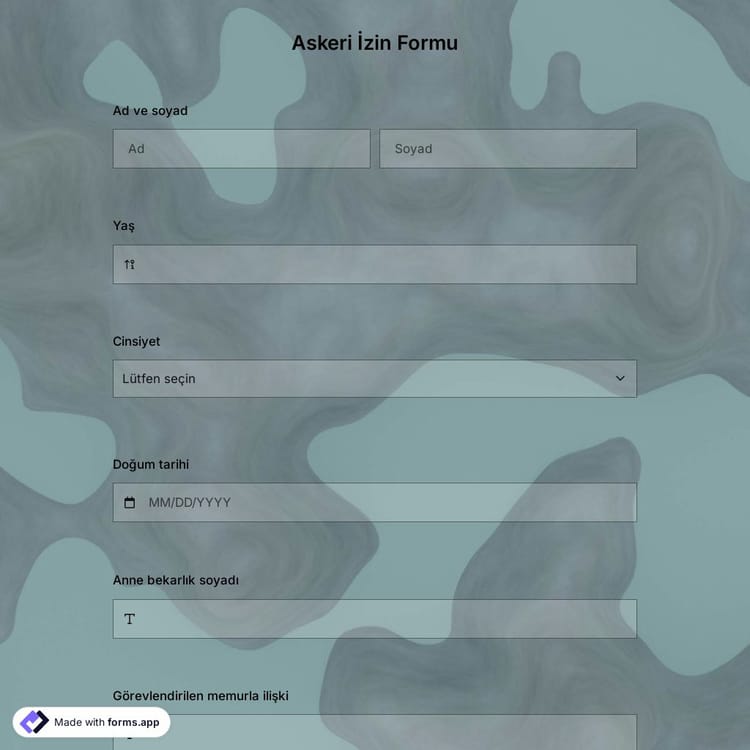 forms.app’in Askeri İzin Formu Şablonu ad, soyad, adres, telefon, izin sebebi ve izin süresini soran alanlarla birlikte gelir. Askeri İzin Formu Şablonu’na yeni sorular ekleyebilir ya da var olanlar üzerinde değişiklik yapabilirsiniz. Dilerseniz, yeni bir form da oluşturabilirsiniz.