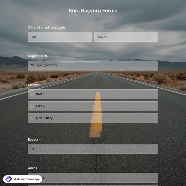 Online başvurular için burs başvuru formu oluşturmak forms.app ile hiç olmadığı kadar kolay. Burs programınız için ücretsiz şablonumuzu kullanabilir ve başvuru sahiplerinden kişisel ve iletişim bilgilerini toplamaya başlayabilirsiniz. Tamamen düzenlenebilir burs başvuru formu şablonumuz, formunuzu oluştururken ihtiyacınız olan tüm esnekliği sağlar. Lise veya üniversite bursu gibi her türlü burs için örnek formu kullanabilirsiniz.