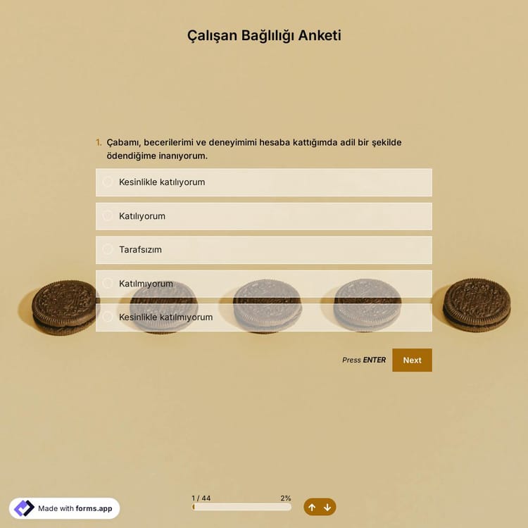 forms.app, anket tasarımınızda size yardımcı olmak için profesyonel görünümlü bir çalışan bağlılığı anket şablonu, ücretsiz ve kullanıma hazır temalar ve hareketli arka planlardan renklere kadar birçok gelişmiş özelleştirme seçeneği sunar. Ve daha da önemlisi, bunları kullanmak için herhangi bir kodlama deneyimine sahip olmanıza gerek yok. Tek yapmanız gereken bazı seçenekler arasında geçiş yapmak ve ilgi çekici bir tasarıma sahip olmanın keyfini çıkarmak.