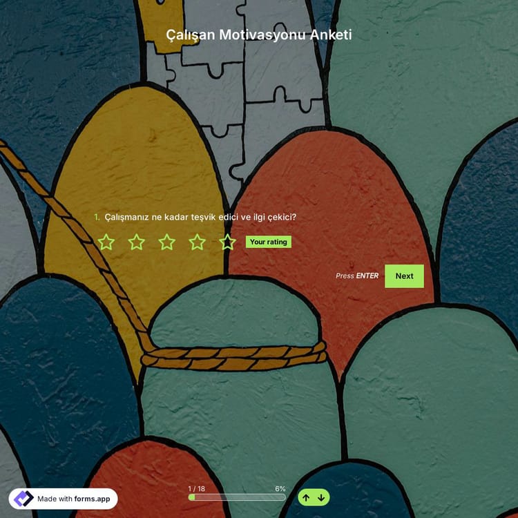 Motivasyon, çalışanların üretkenliğini ve yaratıcılığını gerçekten etkileyen önemli faktörler arasında yer almaktadır. Bu nedenle iş doyumunun yanı sıra çalışanların motive olup olmadıklarını ve kariyer hedefleri olup olmadığını öğrenmelisiniz. forms.app'deki çalışan motivasyon anketi şablonu size standart sorular sunacak ve işinizi daha kolay ve daha hızlı hale getirecek!